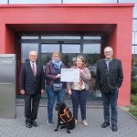 Unsere Schulleitung Frau Mirjam Schuh, Schulsozialpädagogin Astrid Bartholomeyczik und Schulhündin Akemi nahmen diesen freudig in Fürth entgegen und bedankten sich im Namen der gesamten Maischule herzlich für die finanzielle Unterstützung.