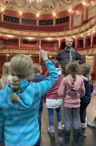 /Im Rahmen des Kulturprojekts KUBIK-Plus durften die 3. Klassen nicht nur die Theatervorstellung „Annelieses und Peterchens Mondfahrt“ besuchen, sondern erhielten auch Einblick hinter die Kulissen. Begleitet vom kleinen Gespenst Zoe, konnten die Kinder bei einer spannenden Führung durch die Probenräume, Garderoben und Geheimräume viele Fragen stellen und so manches Geheimnis über das Theater erfahren.