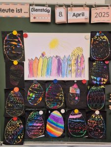 /Die Schülerinnen und Schüler aus der Klasse 1a haben im Kunstunterricht bunte Ostereier gestaltet. Neu erlernt und erprobt wurde hierbei die Kratztechnik. Dabei wird ein Bild mit Wachsmalkreide bunt gestaltet und anschließend mit schwarzer Acrylfarbe bestrichen. Beim herunterkratzen der Farbe entstehen bunte Muster.