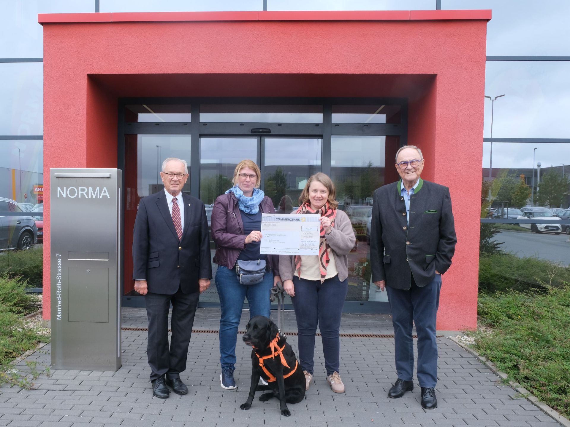 Am 7. Oktober 2025 überreichten Stiftungsvorstand Dr. Wilhelm Polster (l.) und Stiftungsrat Klaus Teichmann (r.) der Manfred Roth Stiftung unserer Maischule einen Spendenscheck für die Schulhund-Ausbildung von Akemi.
